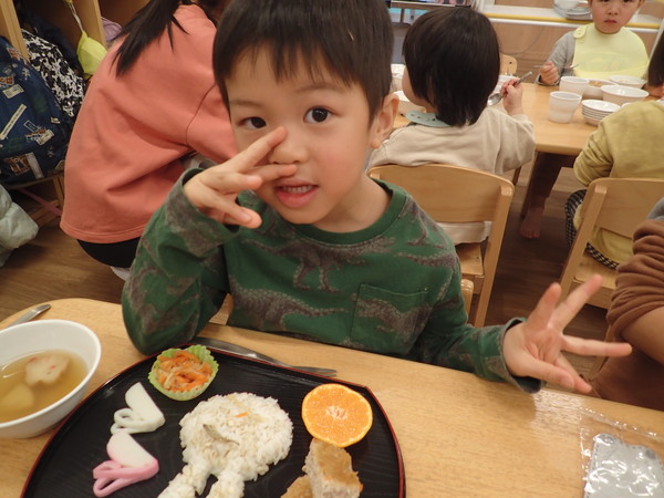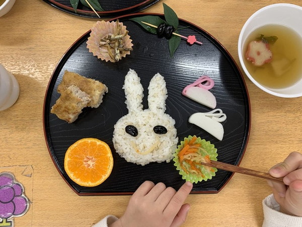 干支のうさぎの形のごはんに、うさぎの飾り切りのかまぼこに歓声があがりました。