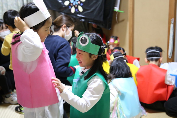 嬉しそうに衣装の準備を手伝い合う5歳児さんです。