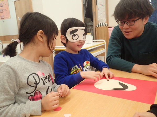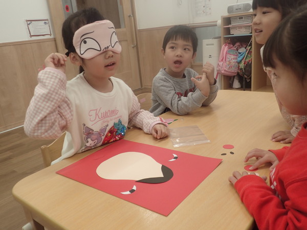 まずは福笑いからご紹介します。目隠しをして、顔のパーツを貼っていきます。