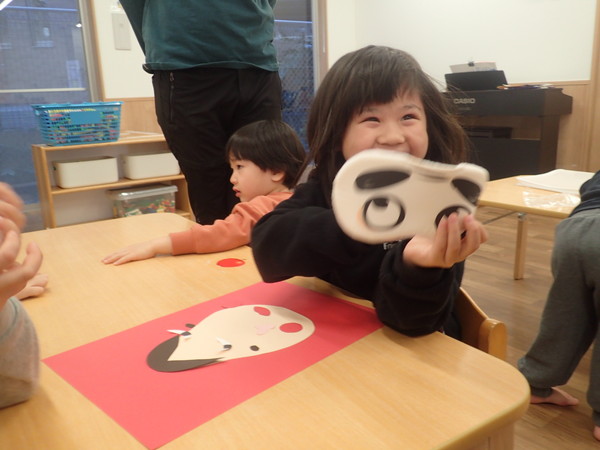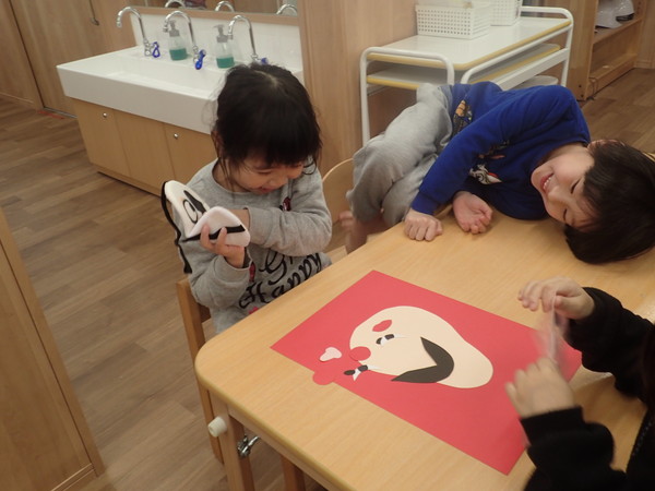 「あけましておめでとうございます!」と元気いっぱいに登園した子ども達。そんな子ども達と一緒に、今月は羽根つきやコマ回し、けん玉に福笑いと、お正月遊びをたくさん楽しんでいます。そんな中からお正月遊びをする姿を少しご紹介しますね。
