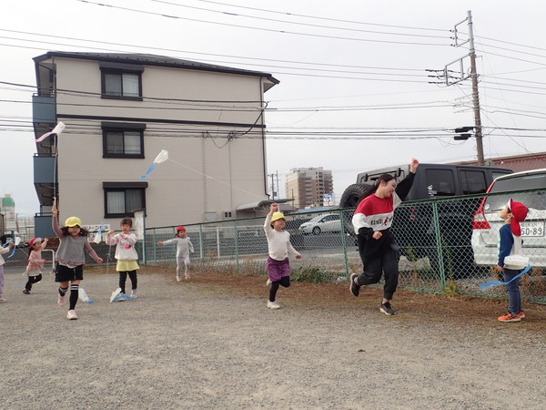 はじめはうまく凧を揚げられませんでしたが、たこ糸の持ち方や走り方を担任から聞くと上手に揚げられるようになりました。