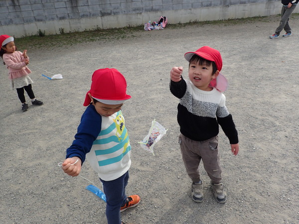 自分で作った凧を持って、この日は近くにあるわんぱく公園でたこあげをしました。