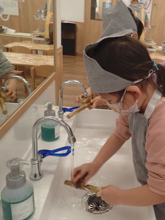 4歳児さんは、ゴボウをたわしでこすり洗いをしました。「白くなるまで洗うんだよね」と丁寧に洗いました。