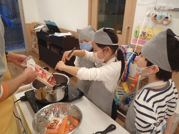 5歳児さんは、IHコンロで肉を炒めます。