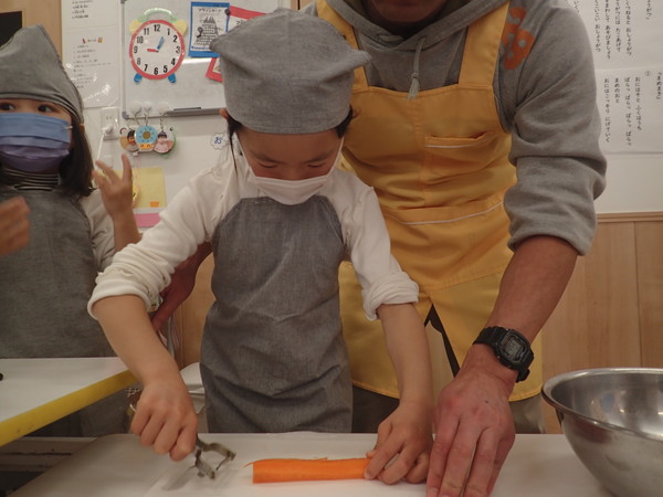 ピーラーの角度や、力の入れ方が意外と難しく「あれ・・・?剥けないよ」と苦戦しながらの皮むきでした。