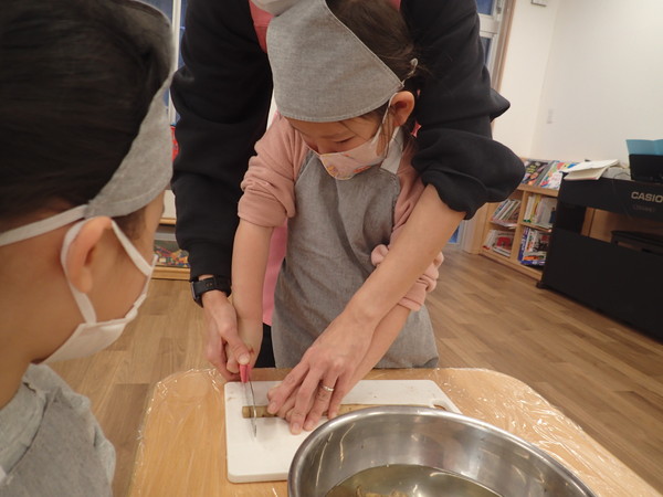 4歳児さんは包丁を使って材料を切ります。