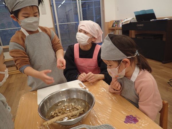 4歳児さんが担当したゴボウはちょっと堅かったのですが、左手はネコの手にしながら一生懸命でした。