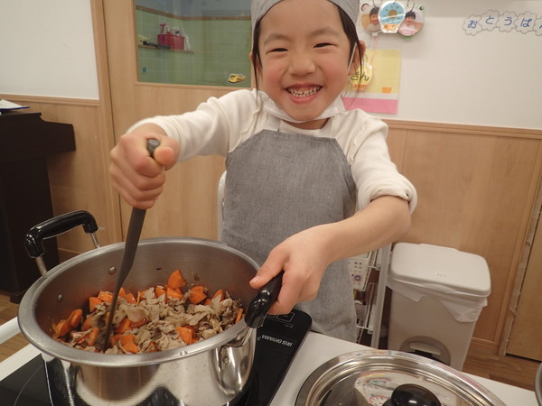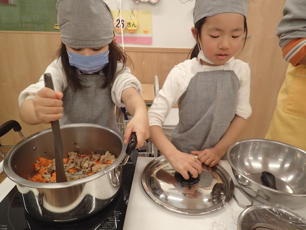 切った野菜を鍋に入れる子、焦げ付かないよう鍋をかき混ぜる子、野菜を切る子と役割分担をしながら作っていきます。