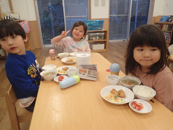 「うわぁ、おいしそう!最高の給食だぁ!」と喜ぶ4歳児さん。