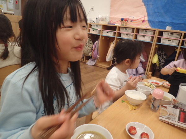 「みんな、美味しいって言ってくれるかな?」とちょっとドキドキしたり、「当たり(大きめサイズに切られた野菜)があるからね、当たりは大きいんだよ」と豚汁の説明をしたりしてくれました。