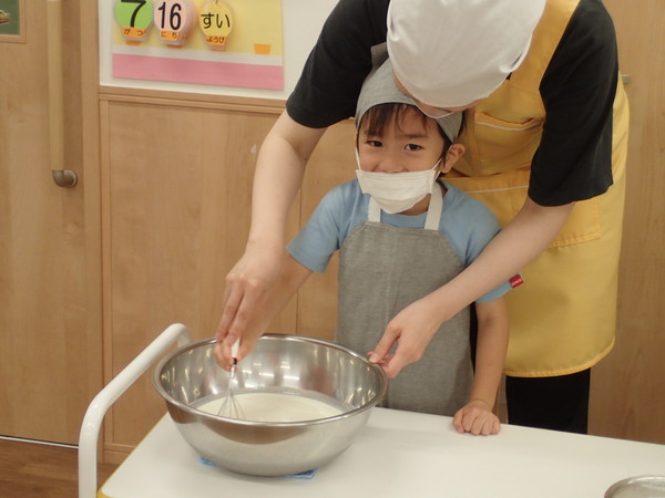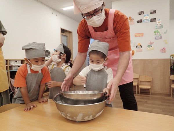 「たくさんまぜまぜするんじゃないかな~?」とこどもたちで考えてみる姿が見られました!