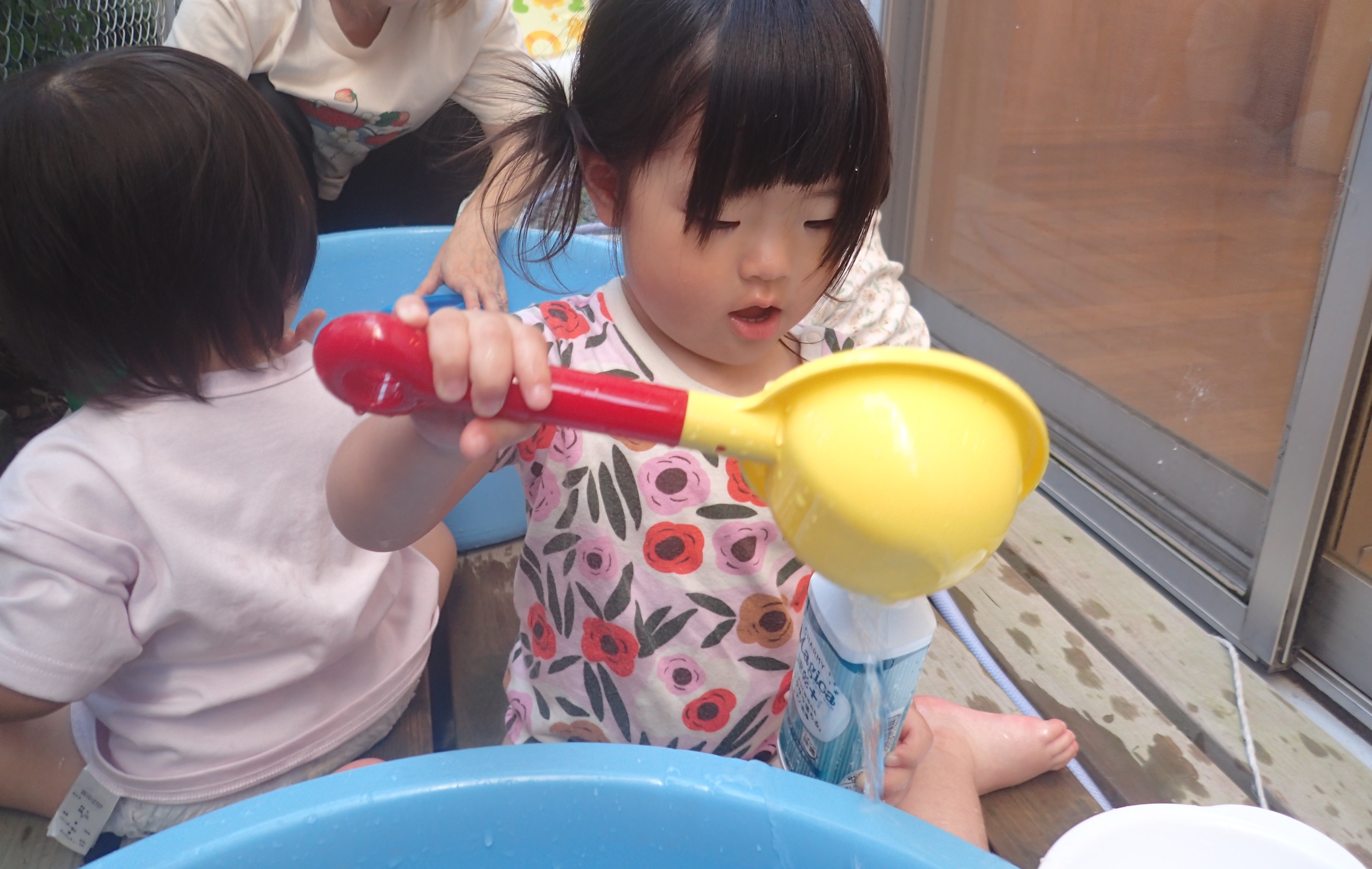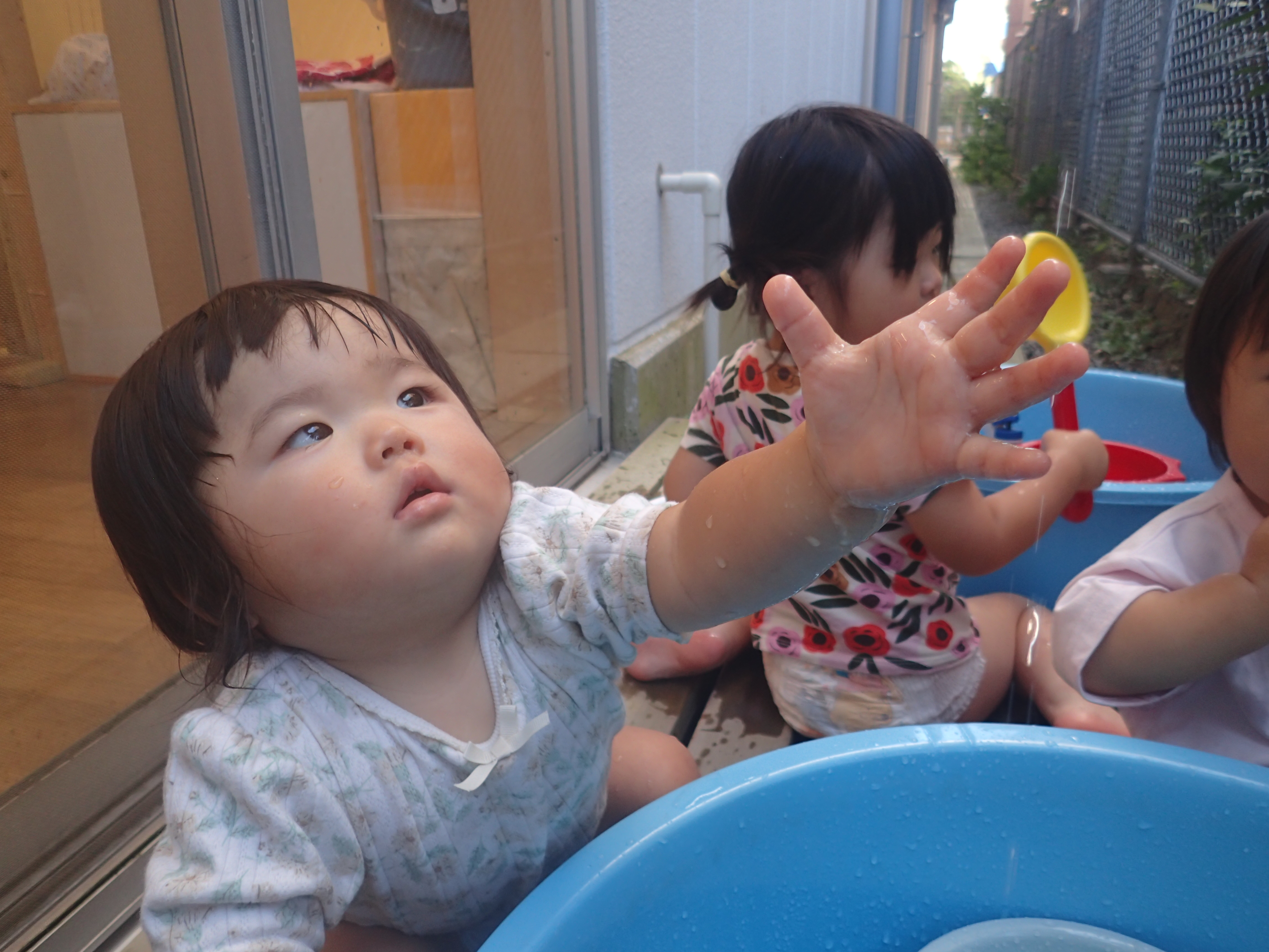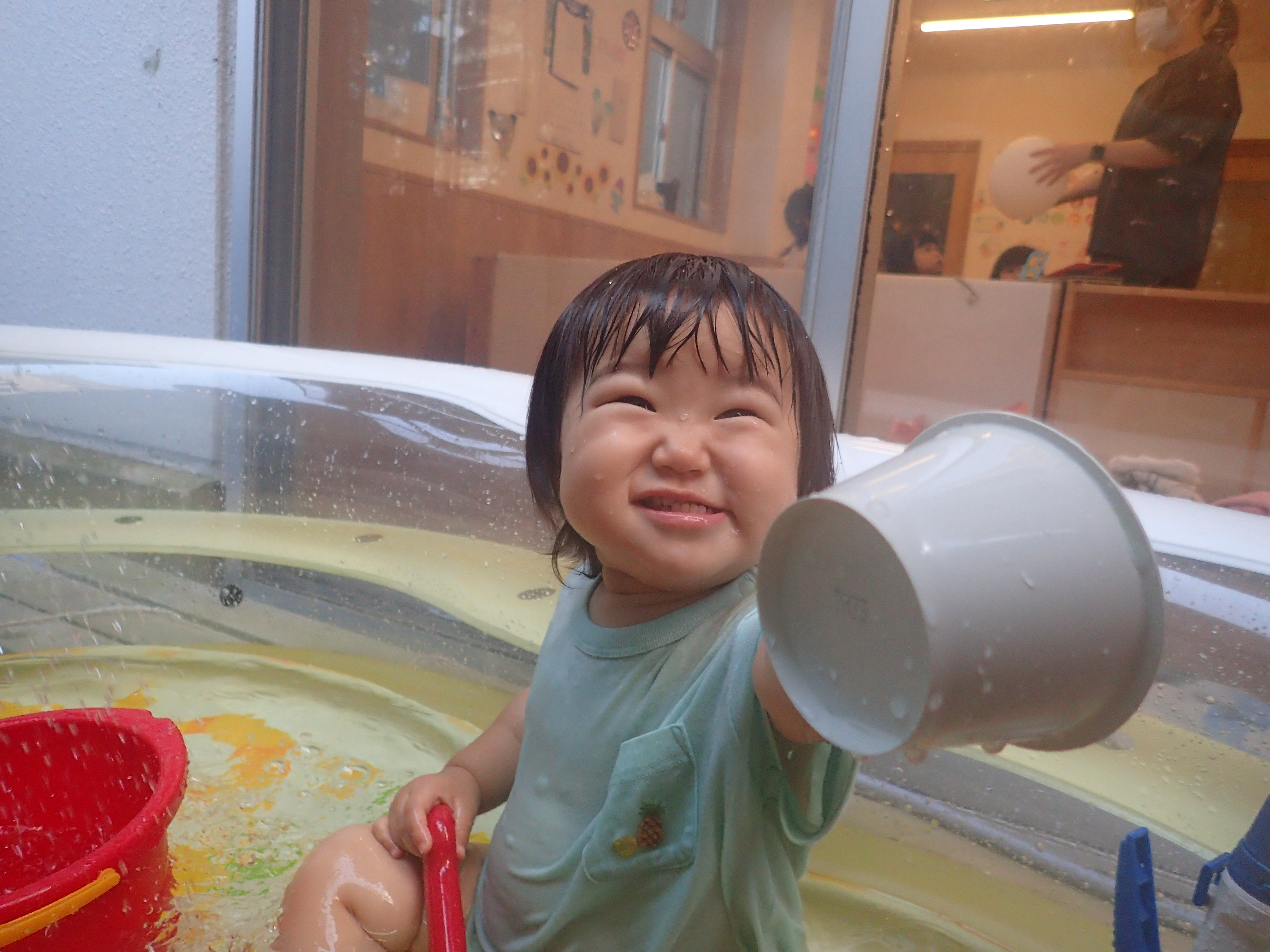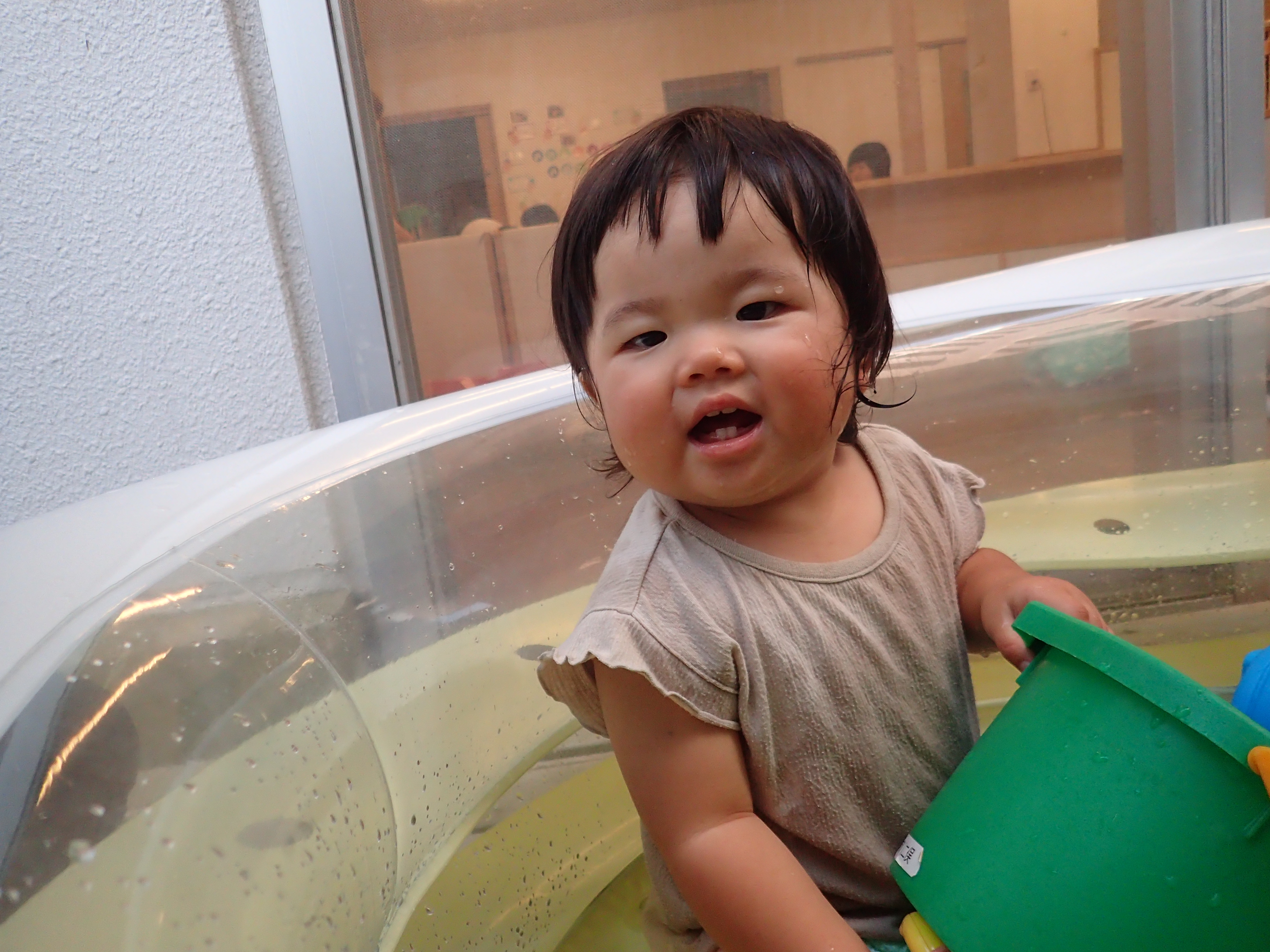7月7日にはプール開きがあり、タライでの水遊びだけでなく、大きなビニールプールに入り、全身で水に触れながら楽しんでいます