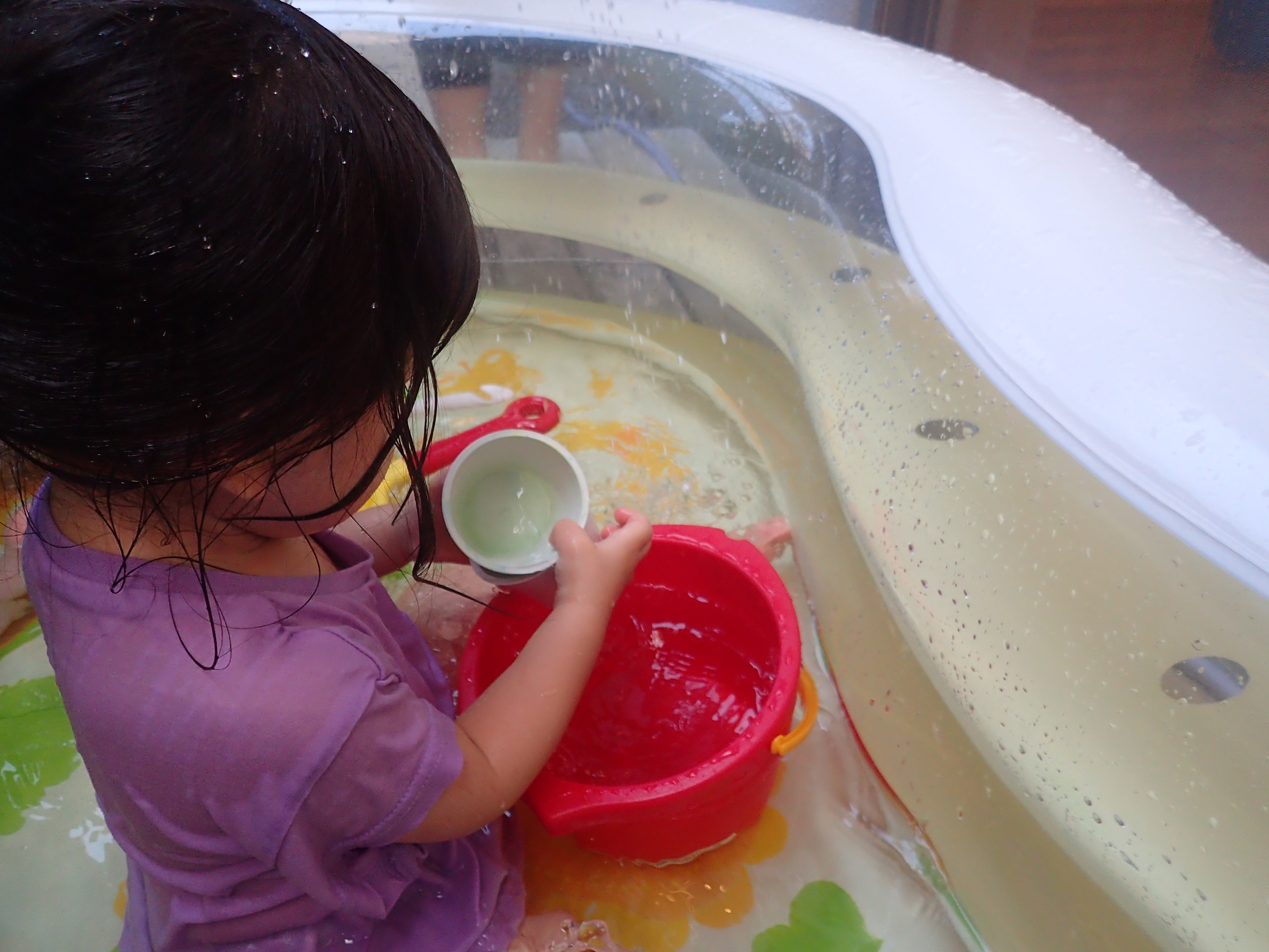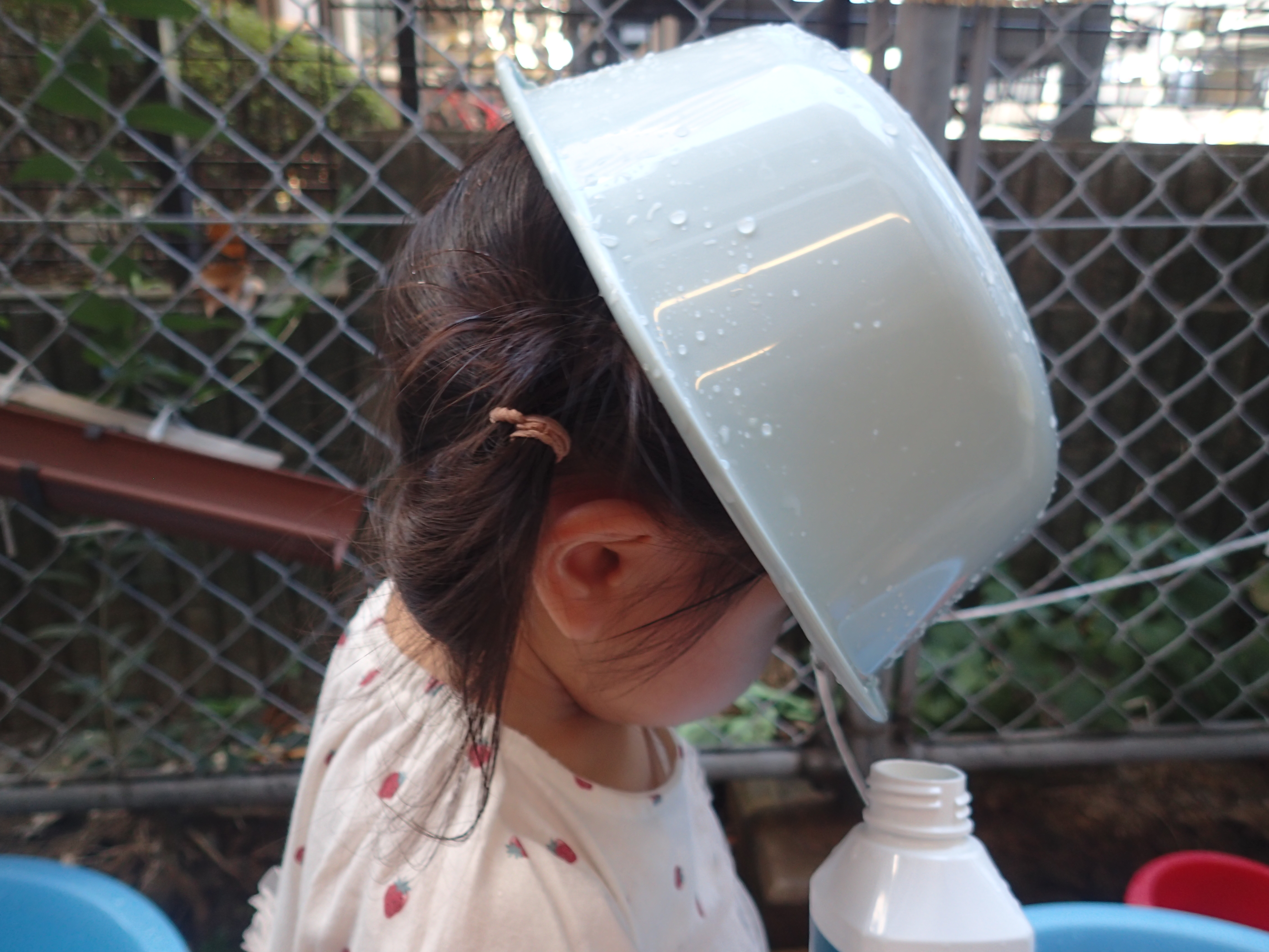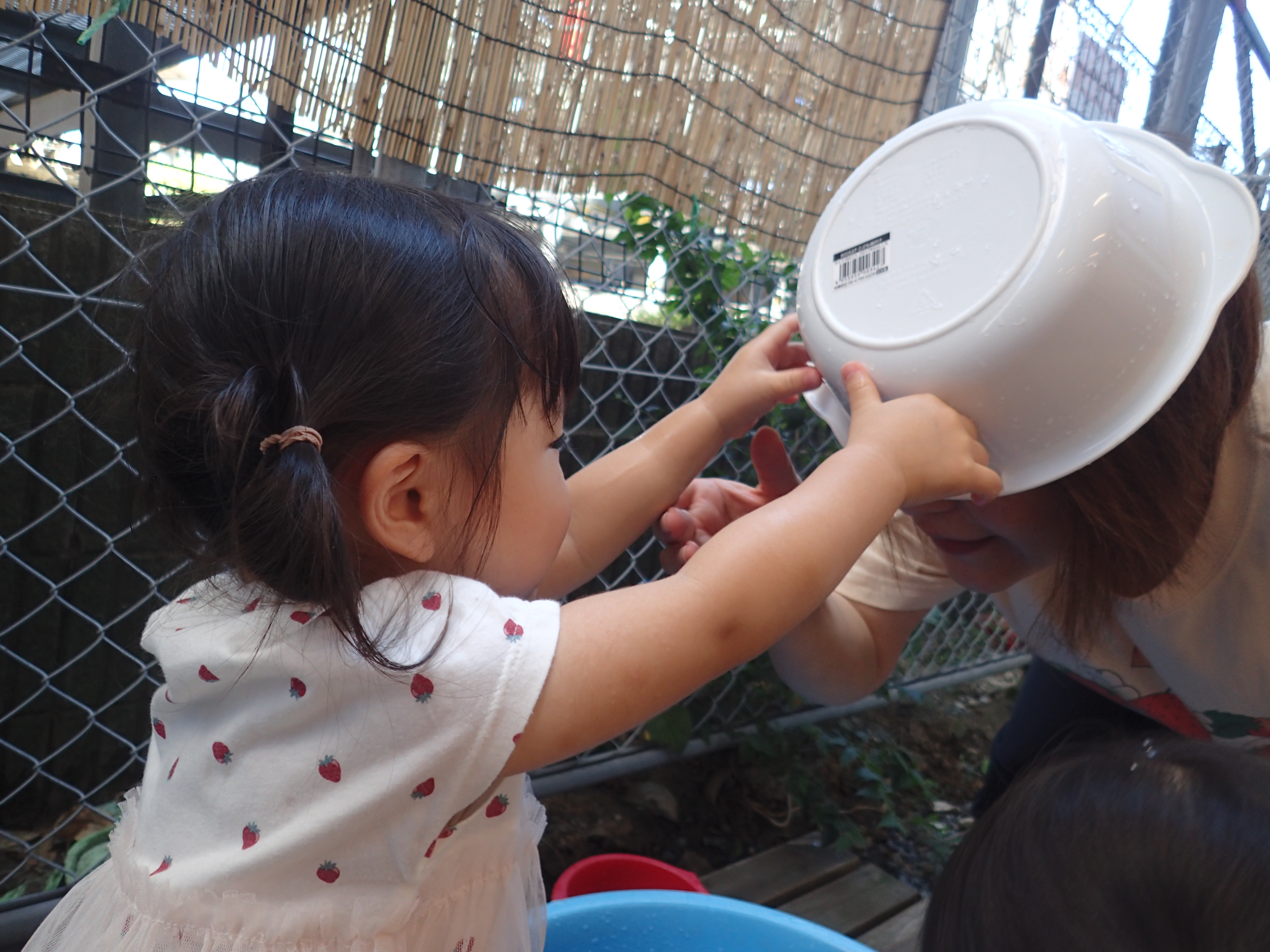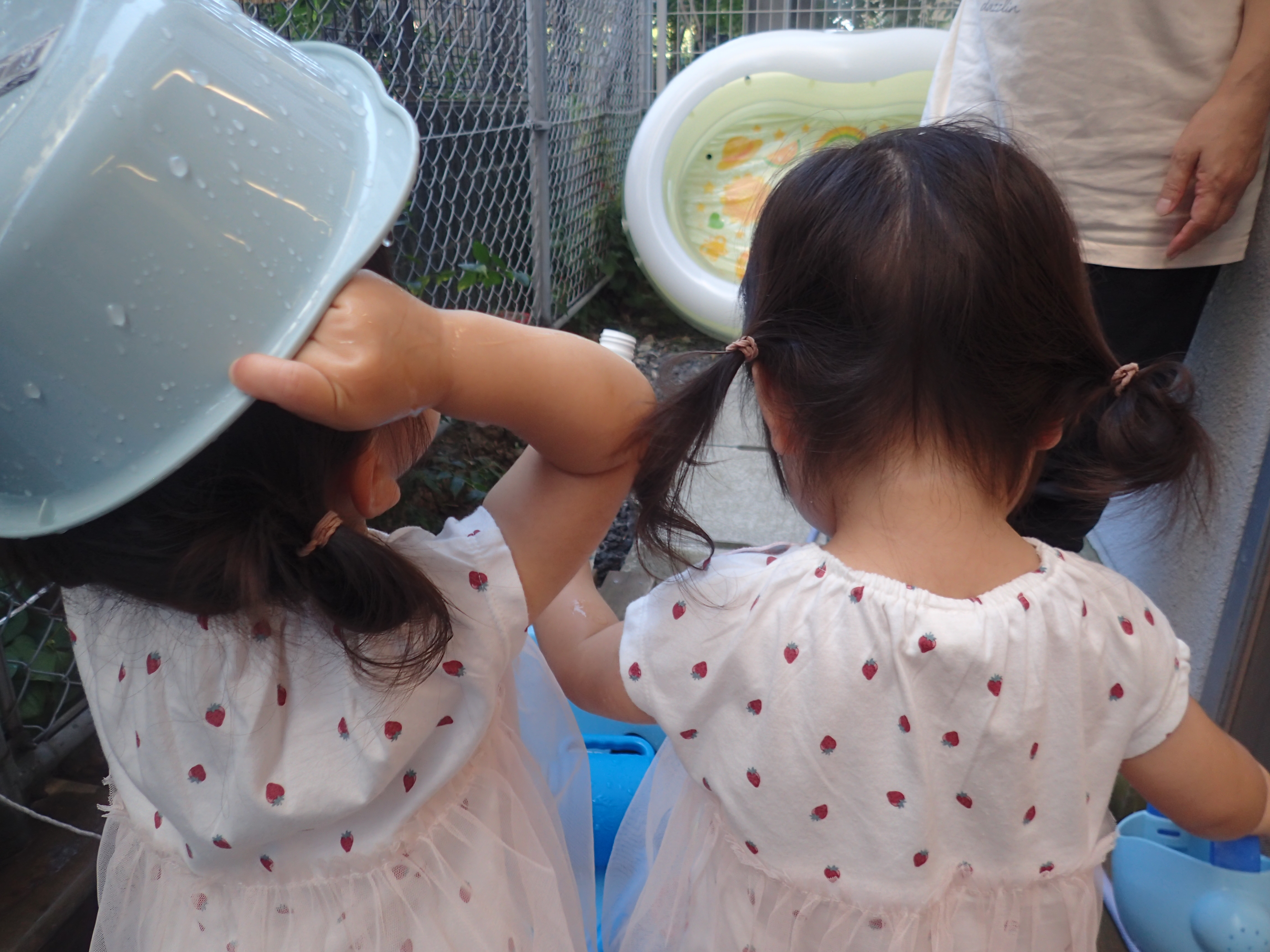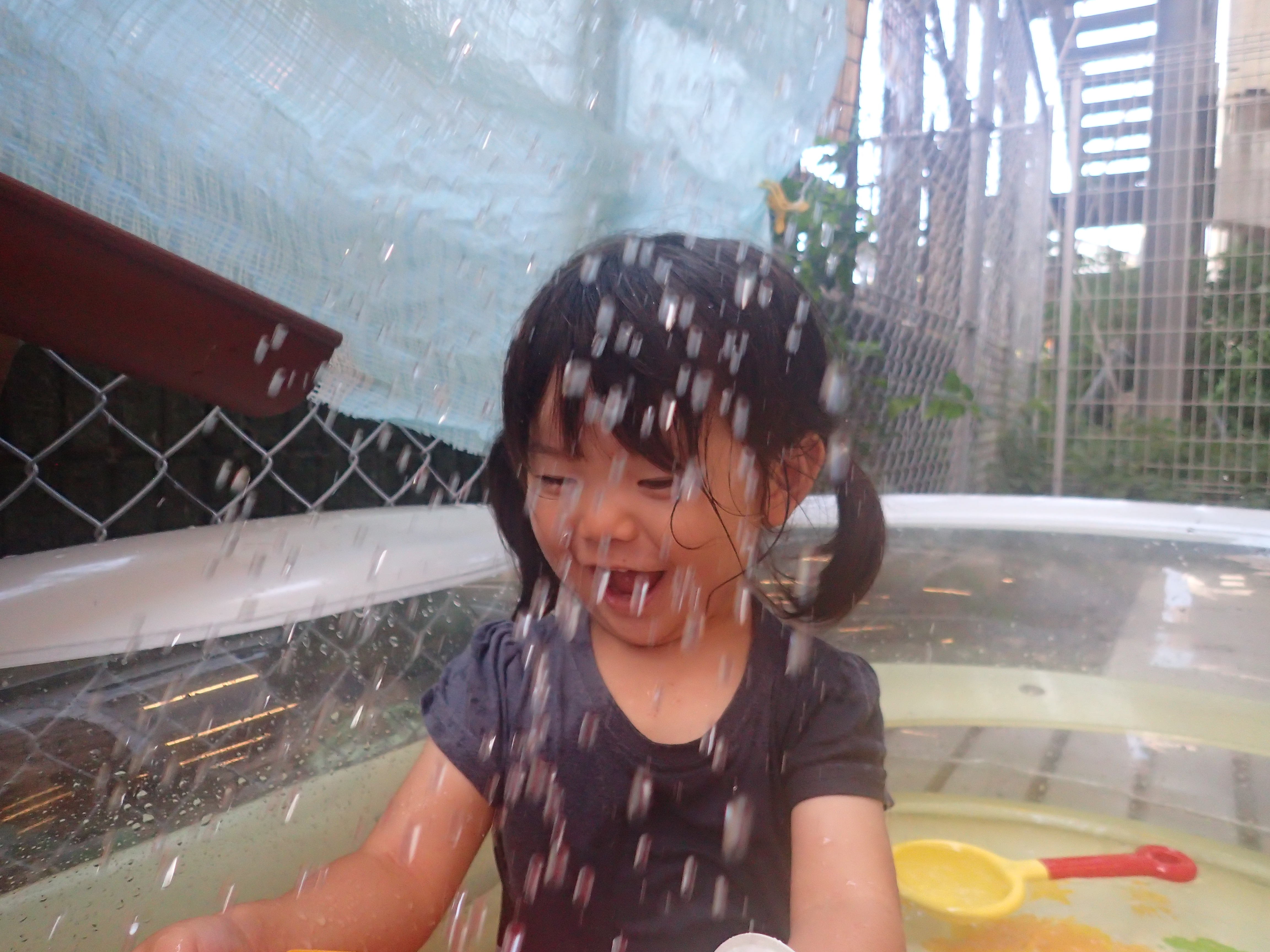 7月7日にはプール開きがあり、タライでの水遊びだけでなく、大きなビニールプールに入り、全身で水に触れながら楽しんでいます