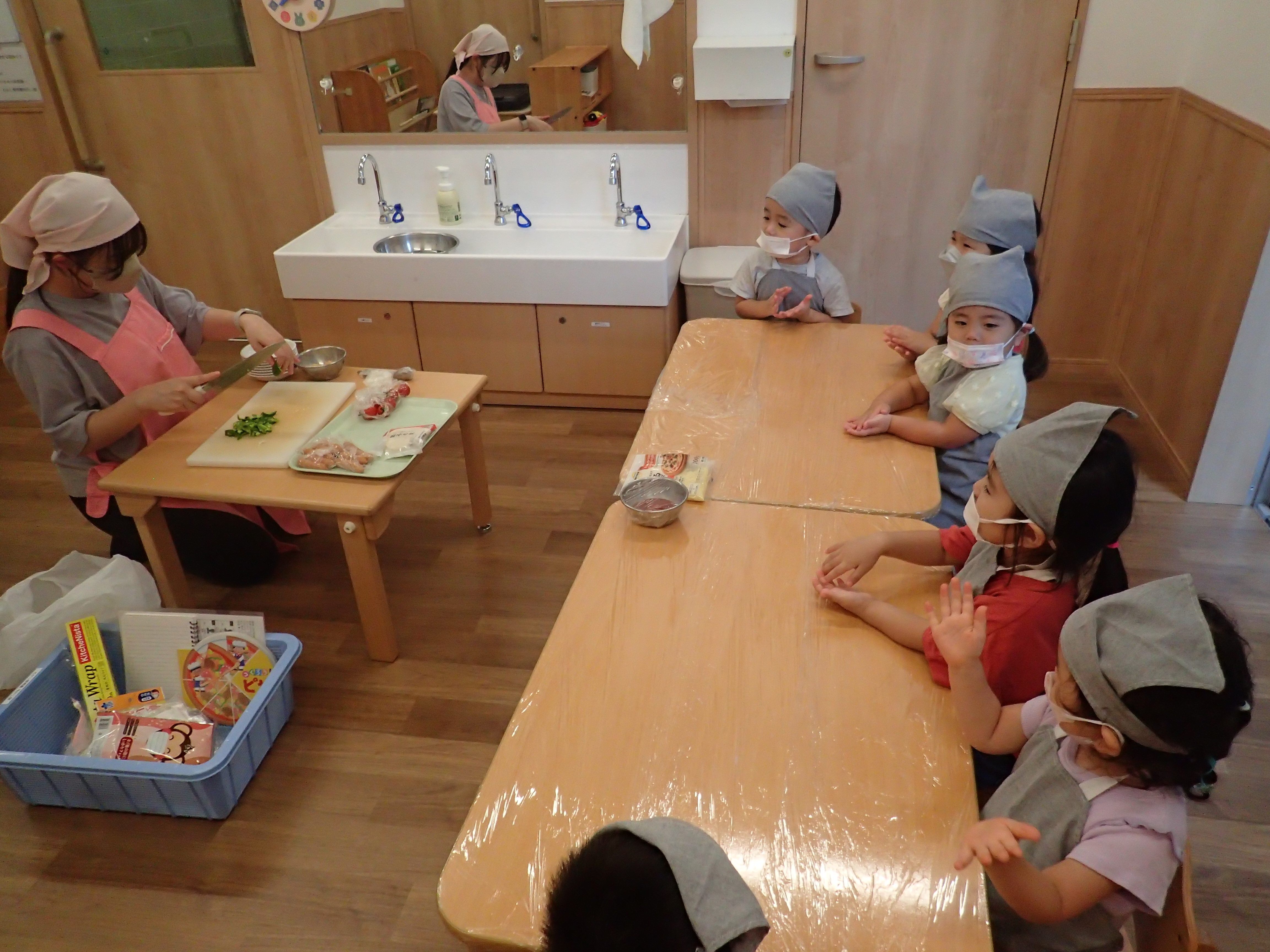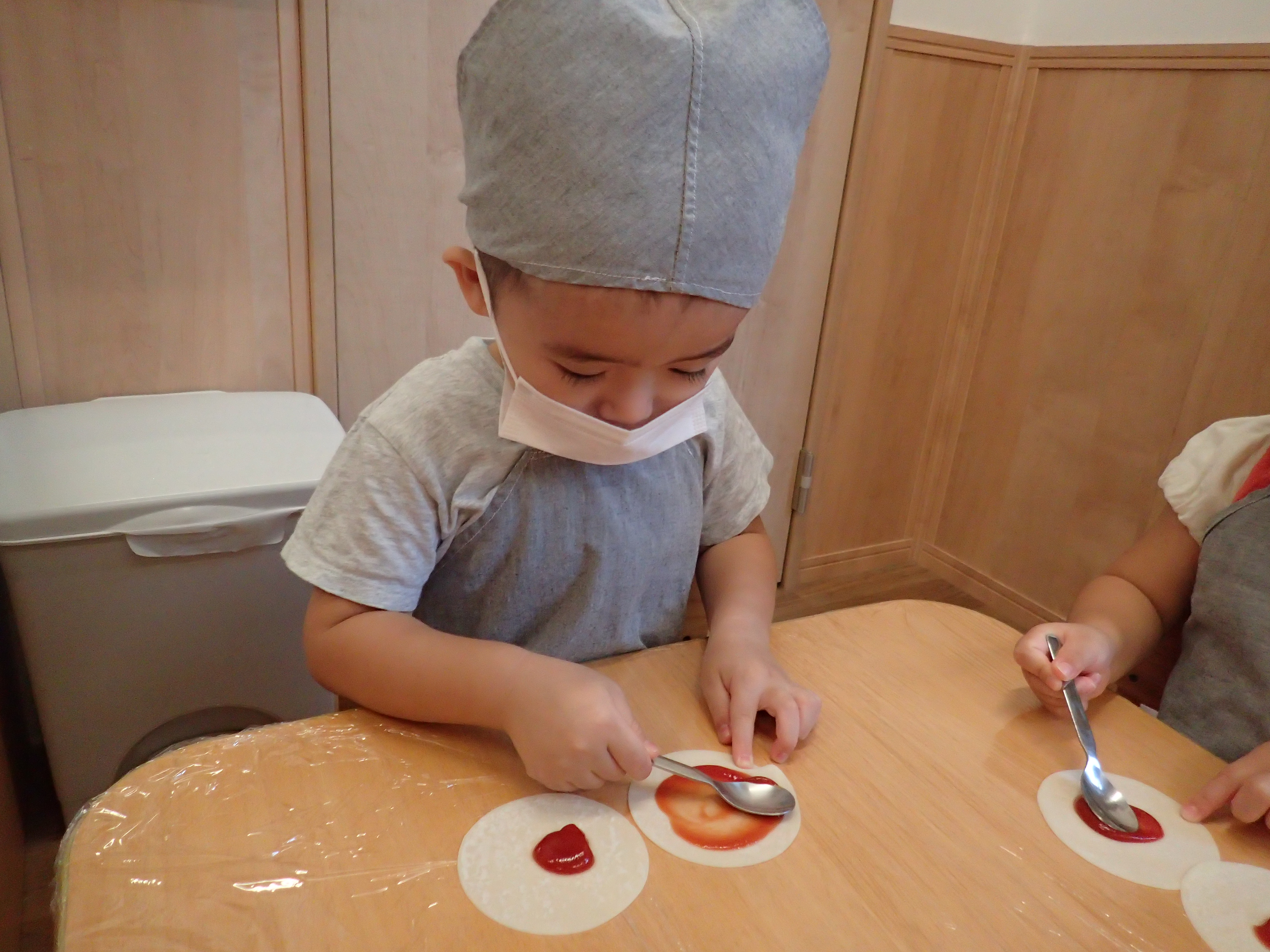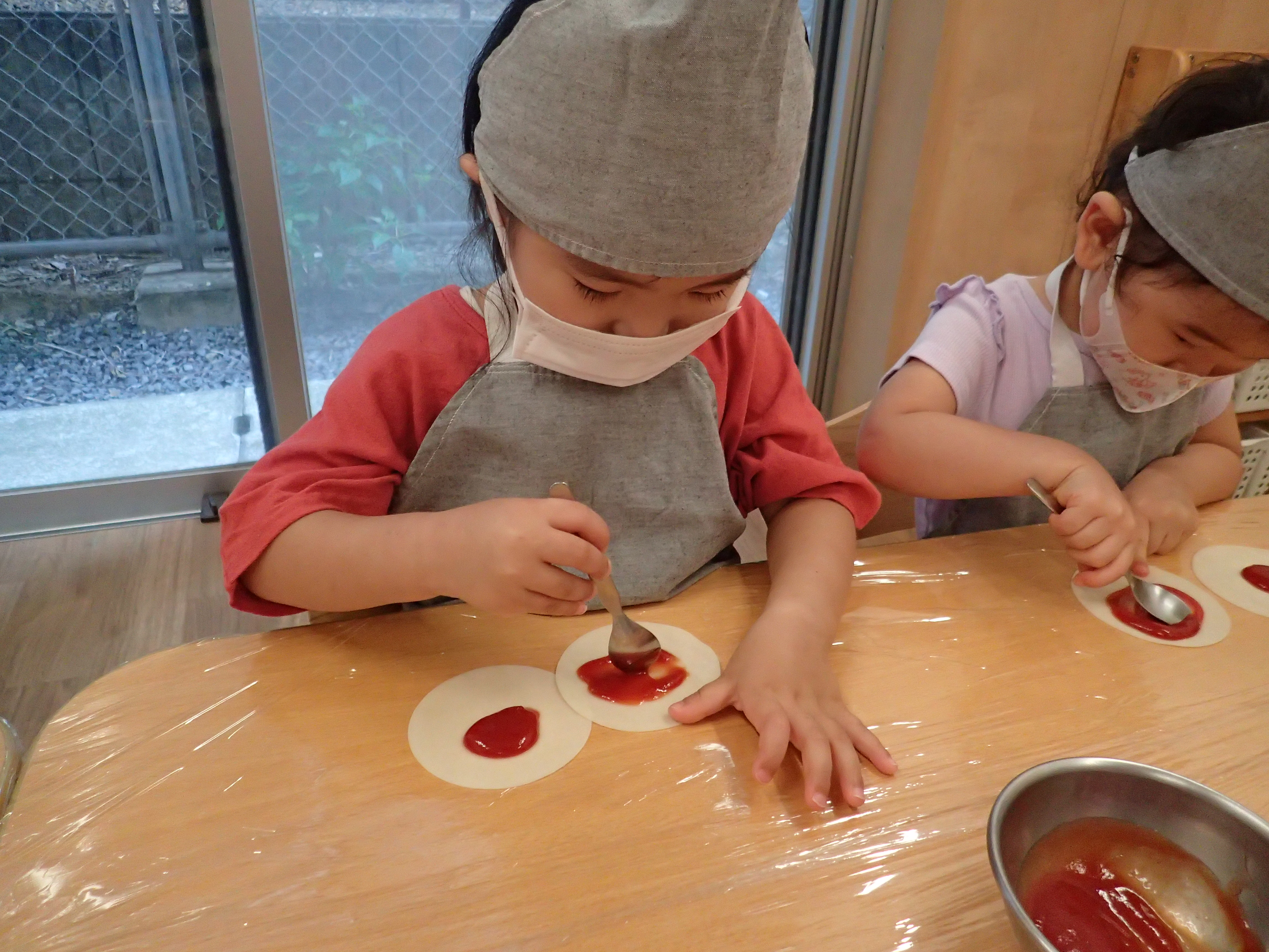 8月の食育は「夏野菜でピザを作ろう!」でした。初めてのクッキングでワクワクドキドキ