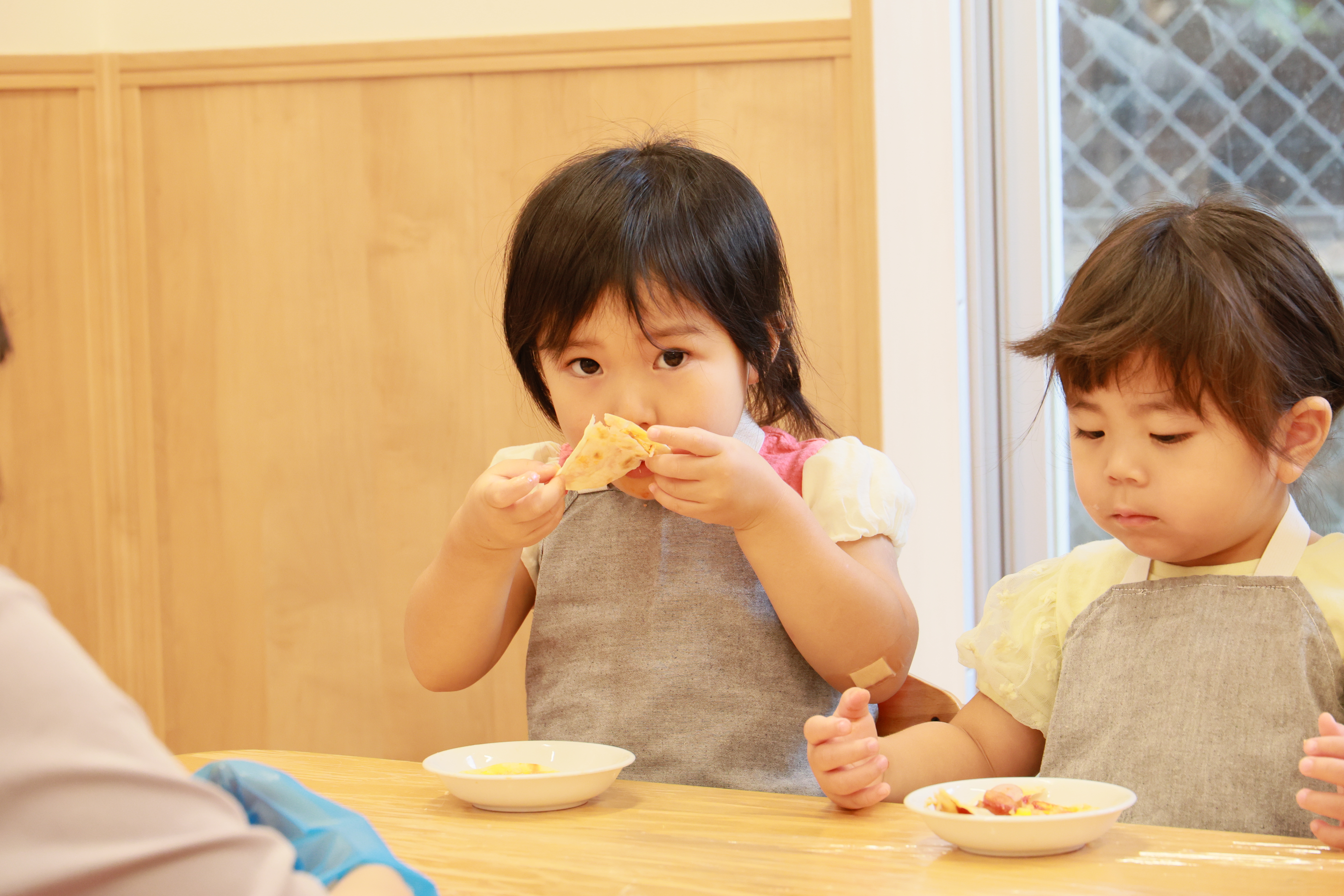みんなで「いただきます」をして自分たちで作ったピザを食べました。「おいしい!」や「チーズとろとろだね」と自分で作ったピザをおいしそうに食べていました