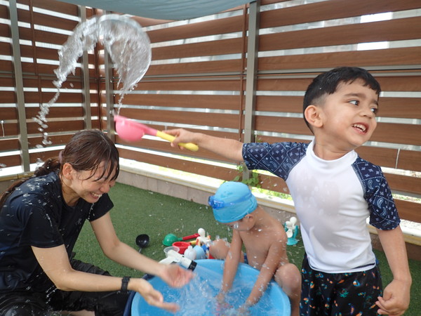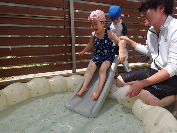 水遊びも、桶から水を使ったり、滑り台を使ってシュ~