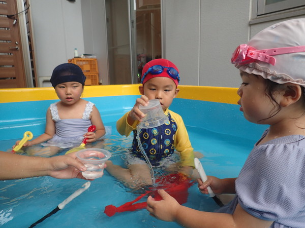 好きな玩具を持ってきて思い思いに水に触れる遊びを楽しみました!