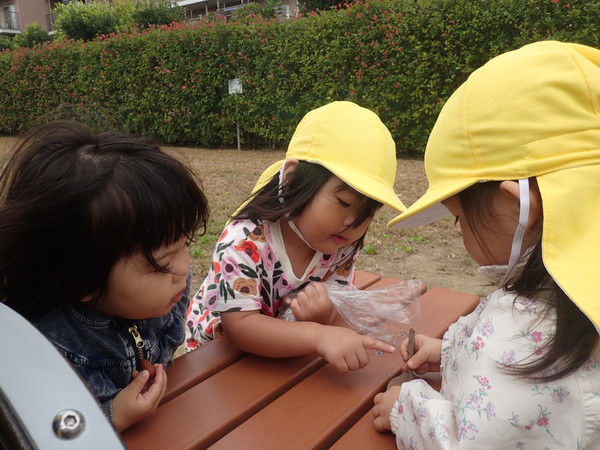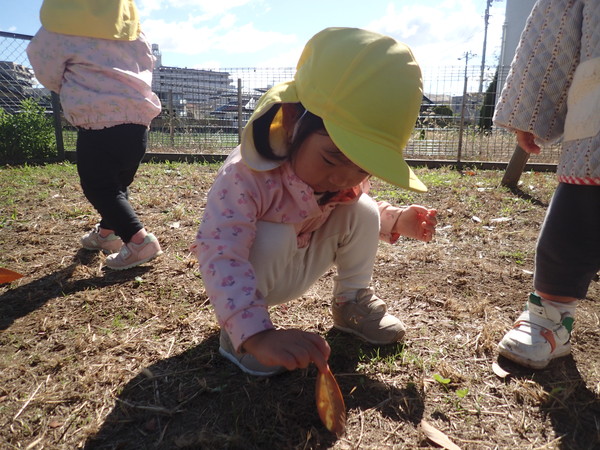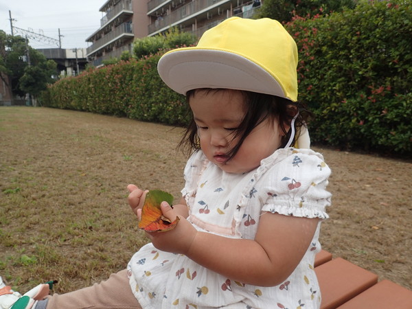 どんぐりの他にも、落ち葉を見つけ不思議そうに見るお友達も