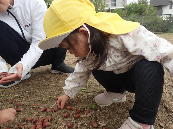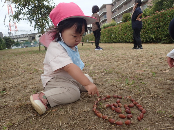 気温も下がり、過ごしやすい季節になりましたね公園では、どんぐりや落ち葉など秋の自然が増えこどもたちは夢中になりながら遊んでいます