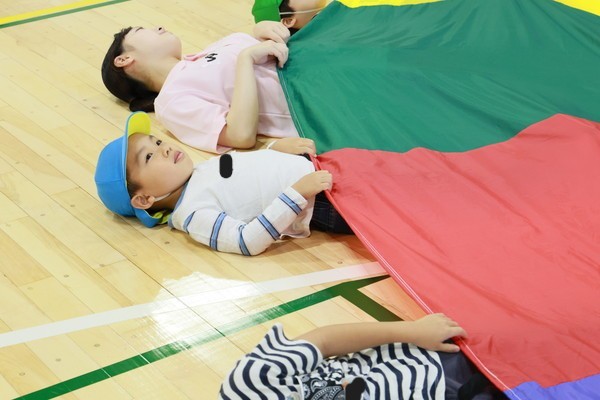 パラバルーンを掛け布団に見立ててすやすや。