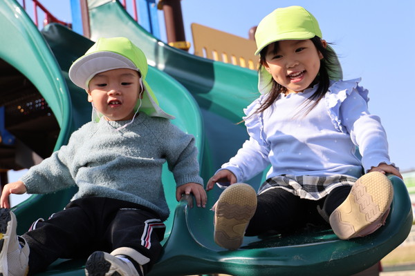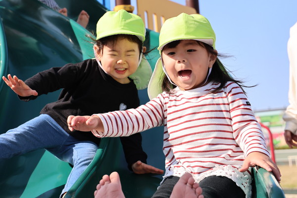 二人同時に滑ることができる滑り台で、「一緒に滑ろう~!」とニコニコです