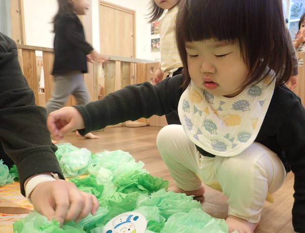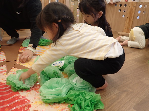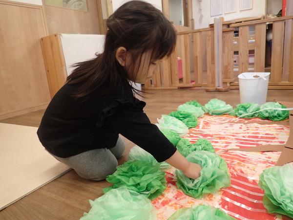クリスマスツリーの形に切った画用紙に、緑色の花紙を貼っていきます!