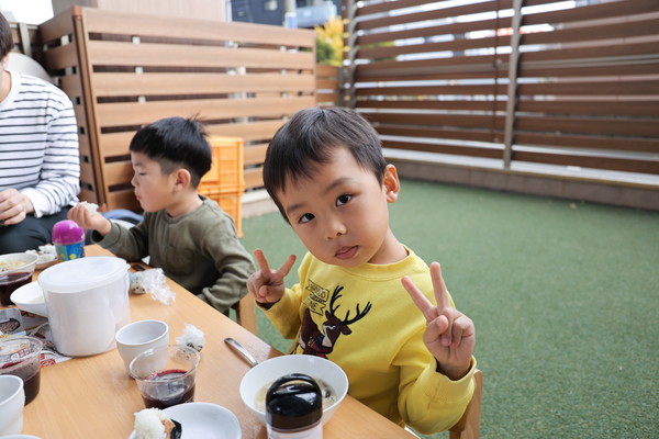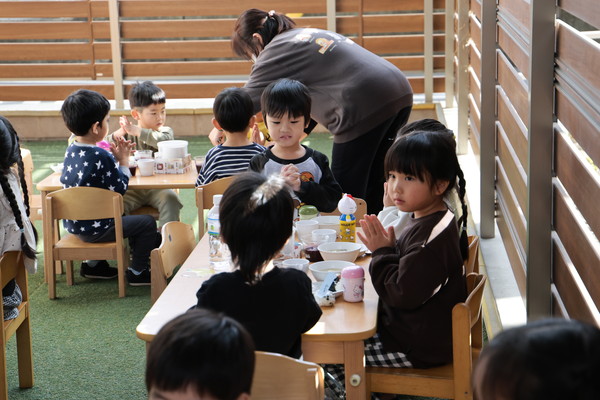 いつもとは違う環境に待ちきれず「はやくたべようよ!」「みんないそいで~」と目にもとまらぬ早さで席に着き、準備万端の姿勢で待っててくれました!