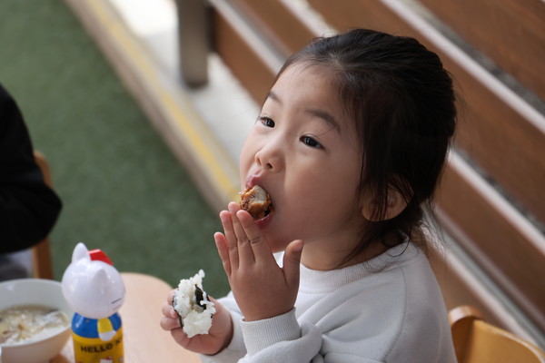 自分で握ったおにぎりを美味しそうに食べるみのり組さん。