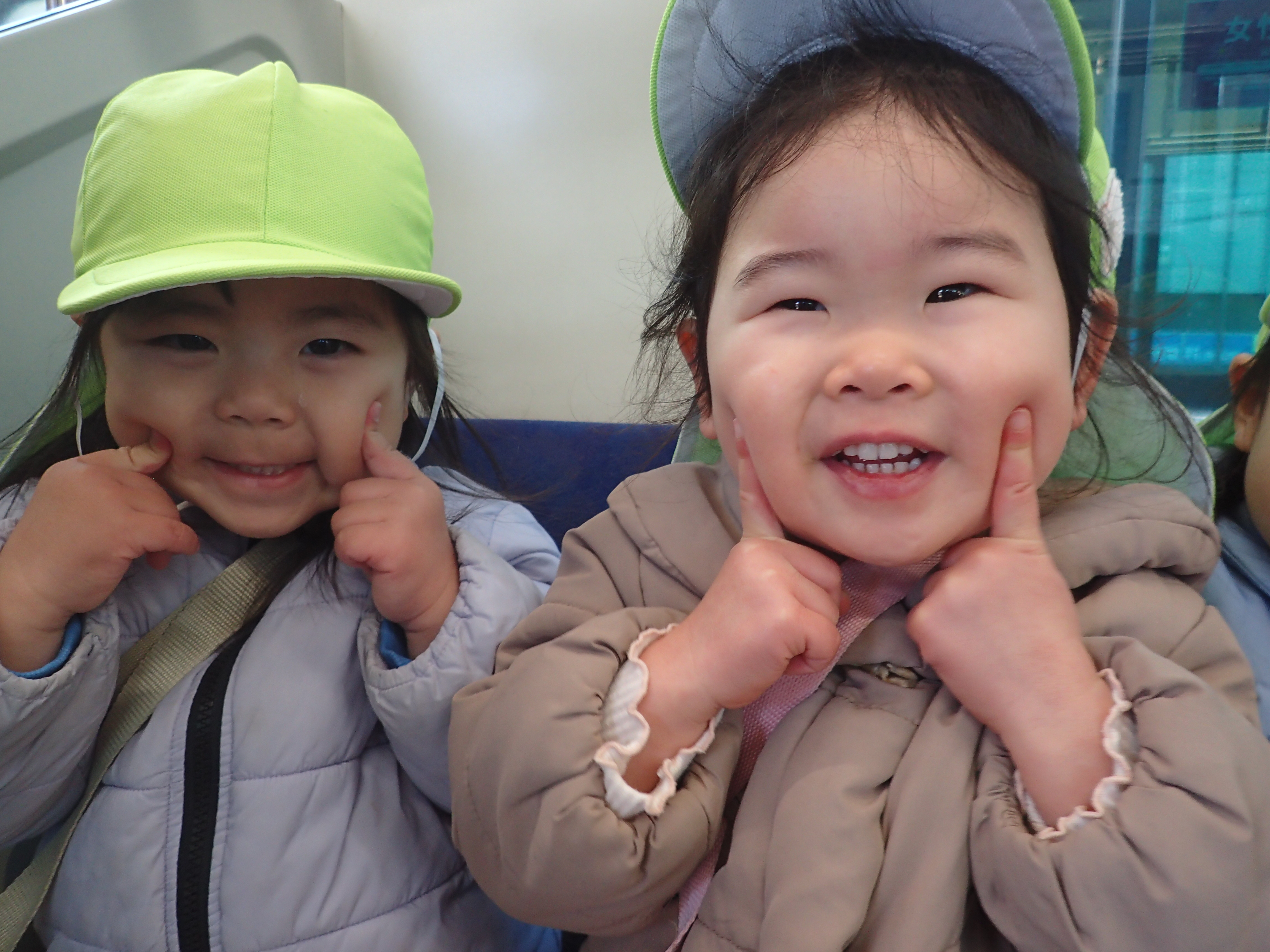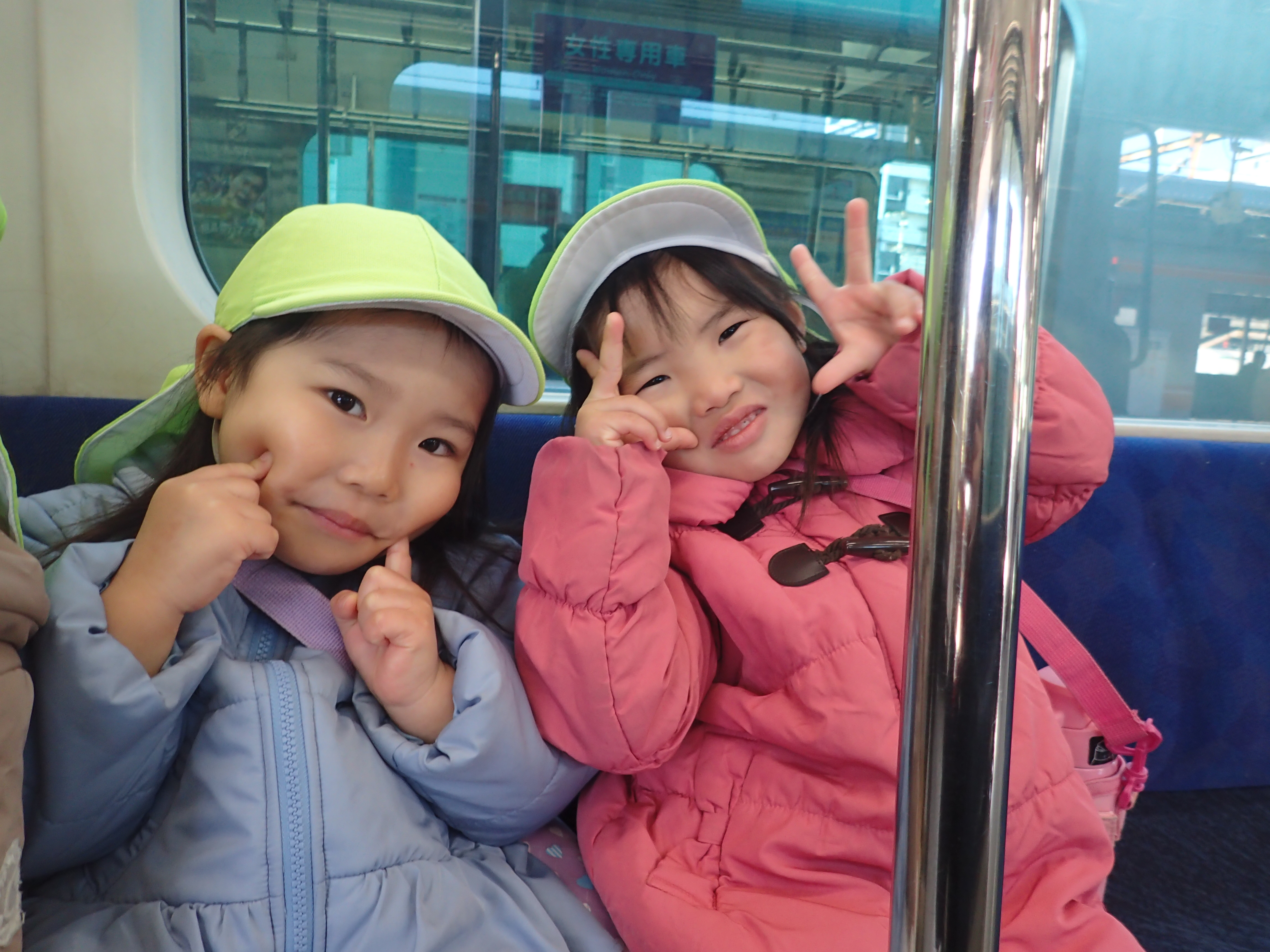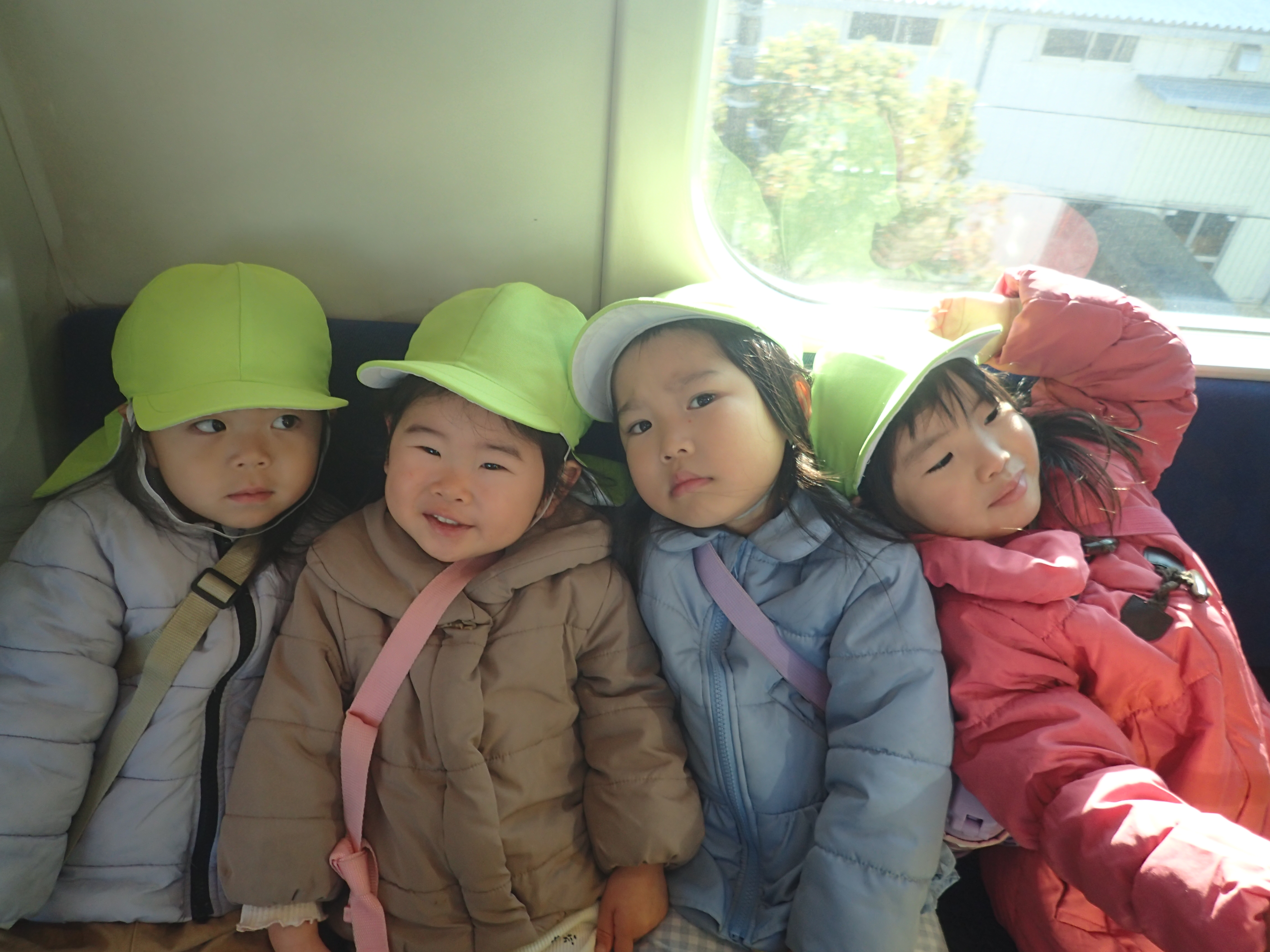 電車の中では椅子に静かに座り、みんなでくっつきながら仲良く座る姿がとてもかわいかったです
