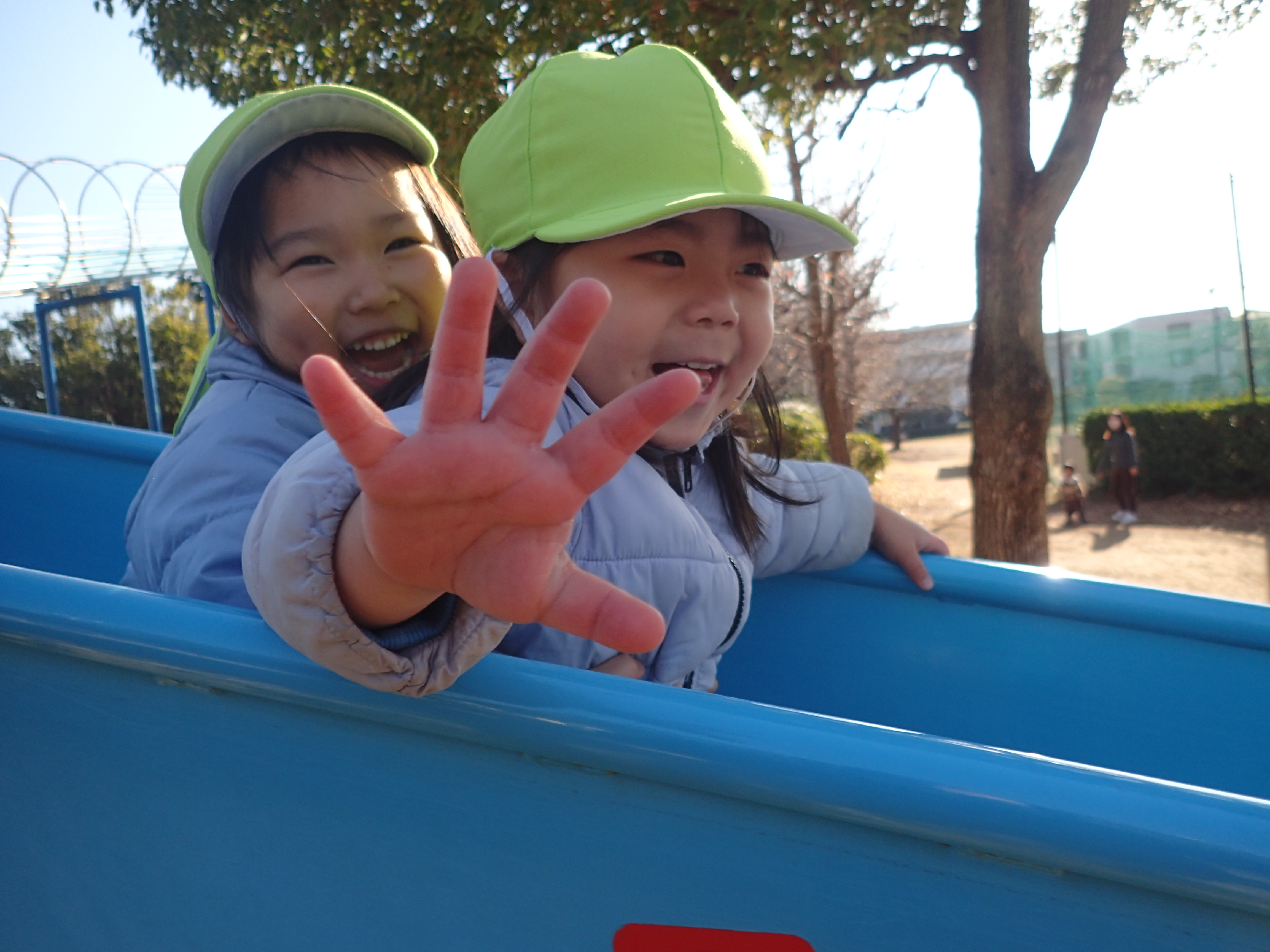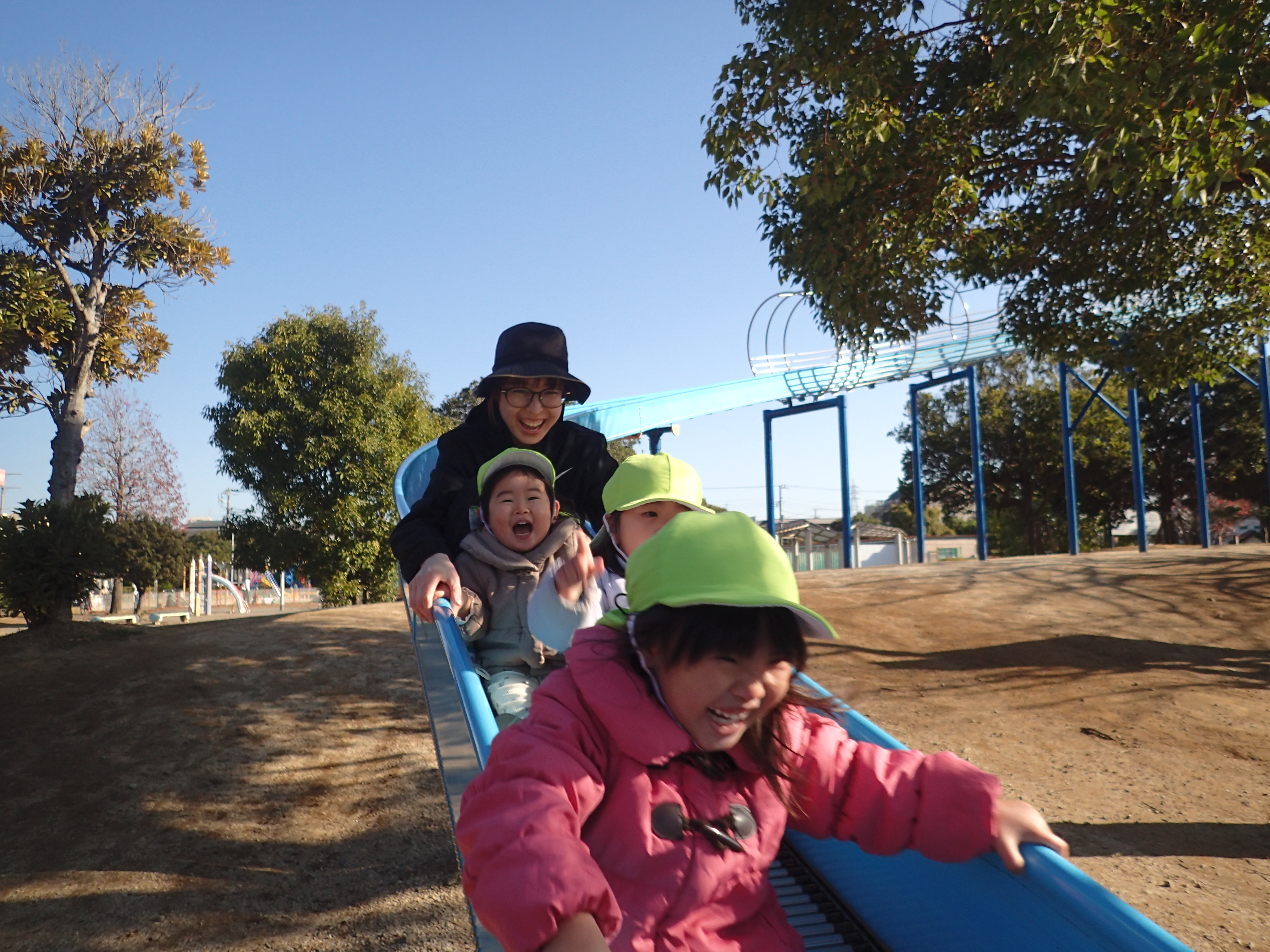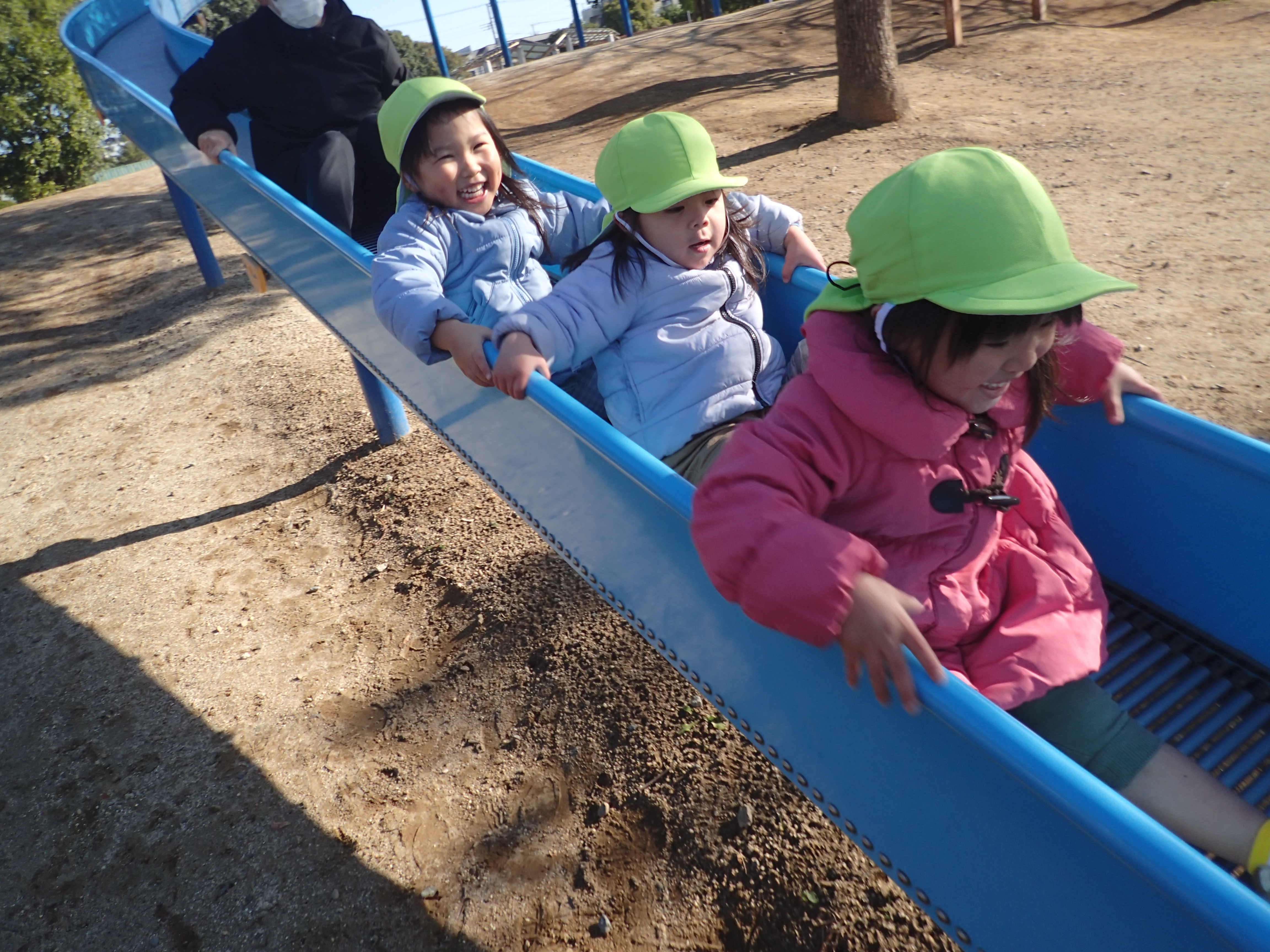 友だちと連結し電車を作って滑ったり、保育者がすごいスピードで後ろから滑ってくると「オオカミがきたぞ」と逃げたりしてとても楽しそうな姿が見られました