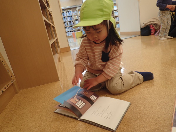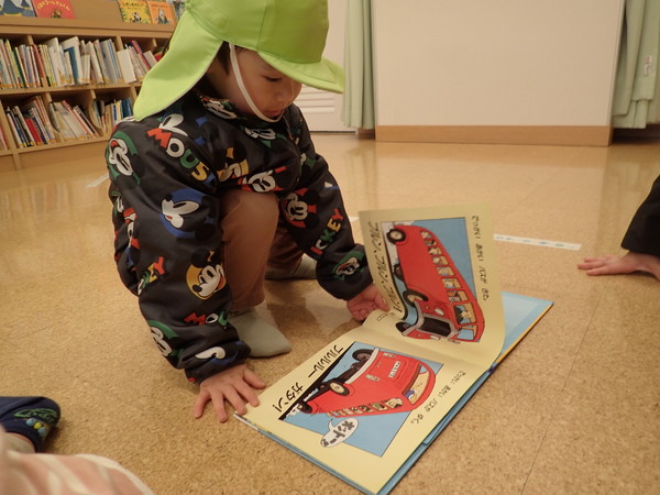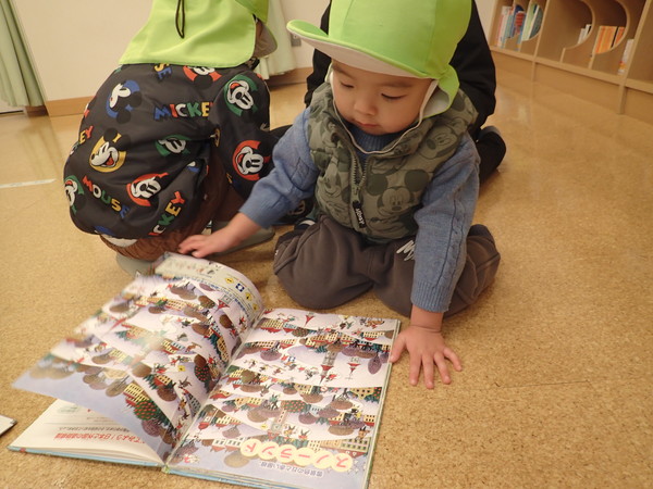 保育園にある馴染みの絵本を見つけ、「これ!保育園にある~!」と嬉しそうに読んでいます