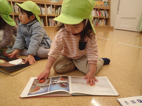 興味のある絵本を手にとり、夢中になって読んでいました